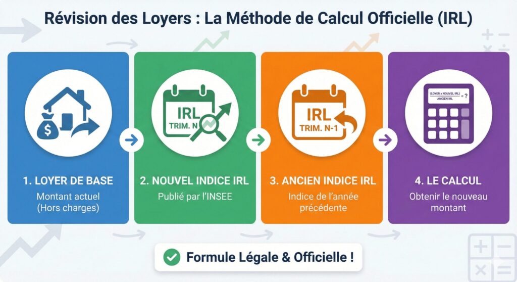 • La formule officielle de calcul s’appuie sur l’indice IRL : loyer actuel × nouvel IRL ÷ ancien IRL, avec vigilance sur le trimestre de référence.